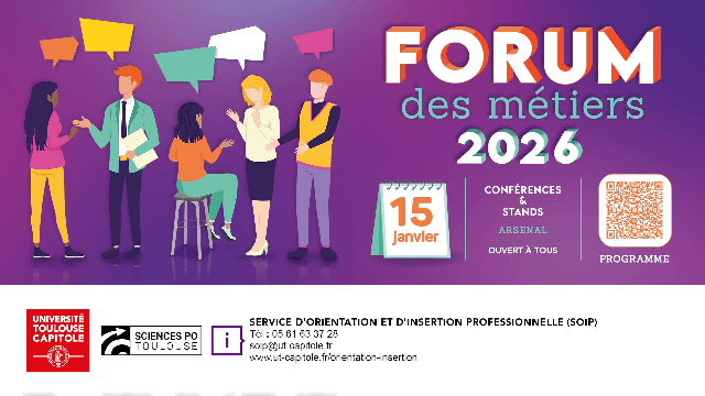 Rendez-vous le 15 janvier 2026 pour la nouvelle édition du Forum des Métiers ! Organisée pour tous les étudiants de l'Université Toulouse Capitole, une journée de 40 conférences et 50 stands pour rencontrer plus de 200 professionnels et découvrir les métiers accessibles après vos études. Evènement co-organisé avec Sciences Po Toulouse, l'Ecole de droit de Toulouse, la Faculté d'Administration et Communication et la Faculté d'Informatique.